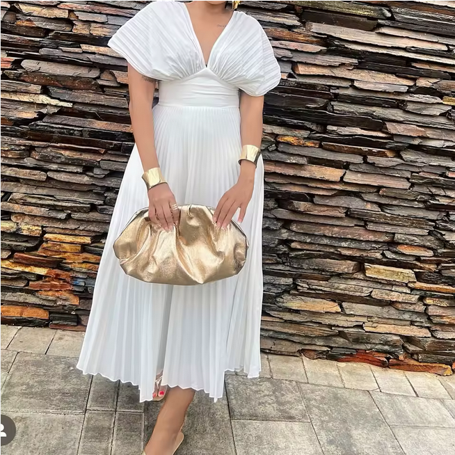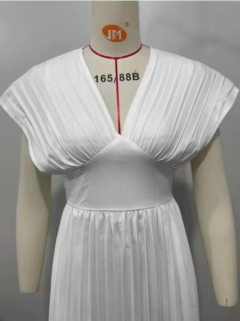 nouvelle robe longue à col en V et plissée unie pour femmes de Sehe