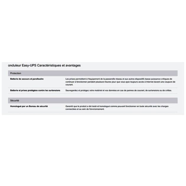 Les prises permettent à l'équipement de la passerelle réseau et aux autres dispositifs basse puissance critiques de continuer à fonctionner pendant plusieurs heures pour que vous ayez toujours accès à Internet lors d'une coupure de courant.