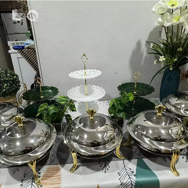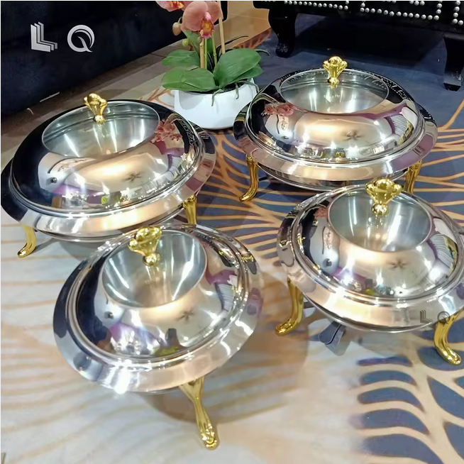 Plat à friture chauffant rond en acier inoxydable durable de luxe avec couvercle de cadre plateau chauffant pour buffet support de carburant pour hôtel et restaurant