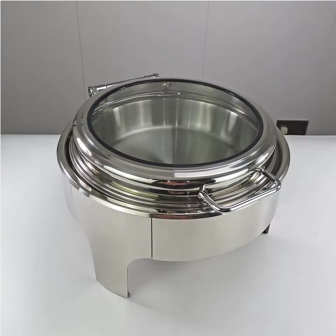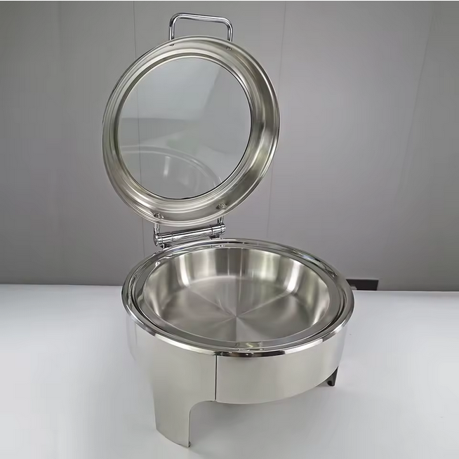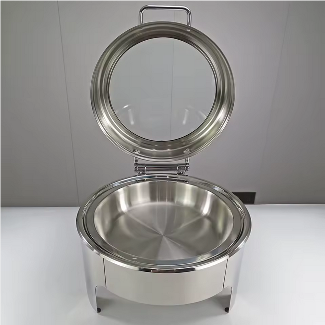 Ce grand plat chauffant en acier inoxydable avec couvercle en verre est conçu pour le service de restauration en buffet, doté d'un design rond de 6 litres et compatible avec des plaques chauffantes électriques