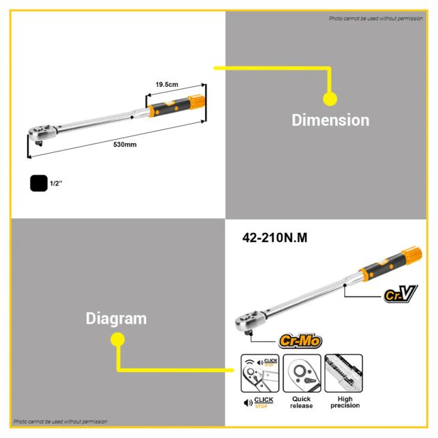 Grâce à un mécanisme intuitif, ajustez facilement le couple nécessaire pour vos travaux. La longueur de 530 mm assure un levier optimal pour une utilisation sans effort.