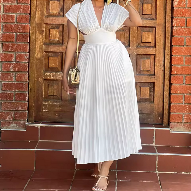 nouvelle robe longue à col en V et plissée unie pour femmes de Sehe