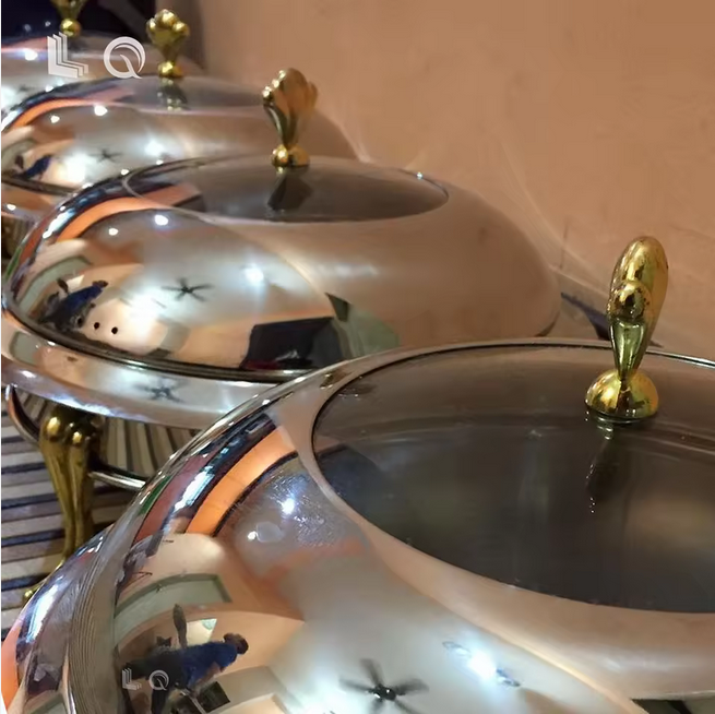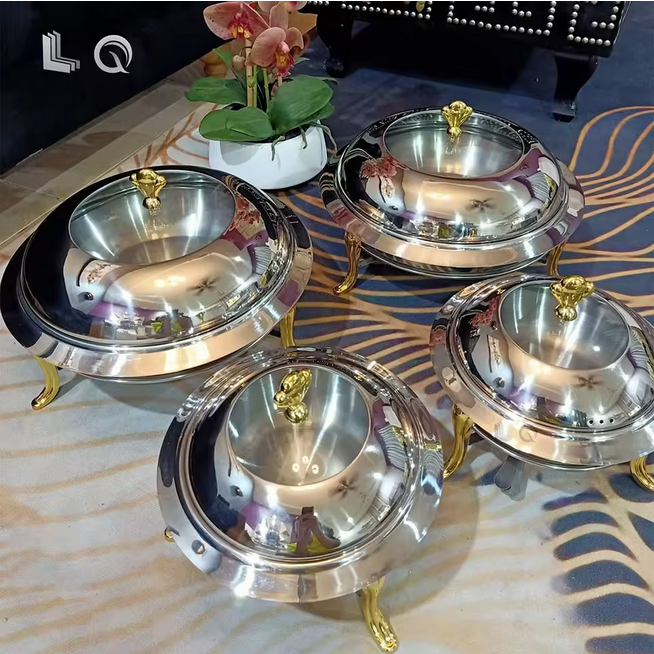 Plat à friture chauffant rond en acier inoxydable durable de luxe avec couvercle de cadre plateau chauffant pour buffet support de carburant pour hôtel et restaurant