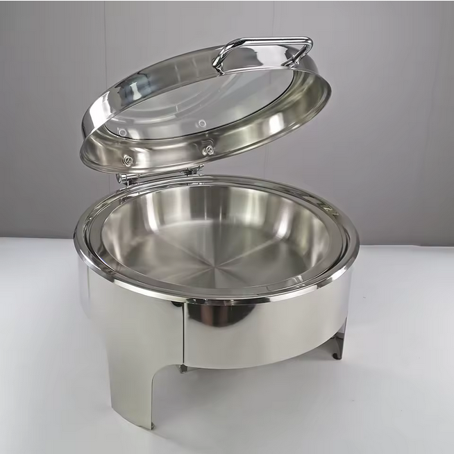 Ce grand plat chauffant en acier inoxydable avec couvercle en verre est conçu pour le service de restauration en buffet, doté d'un design rond de 6 litres et compatible avec des plaques chauffantes électriques
