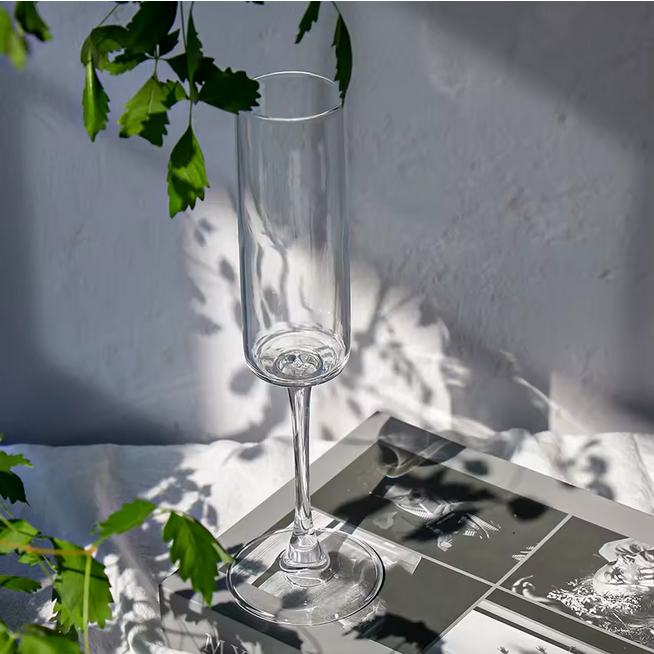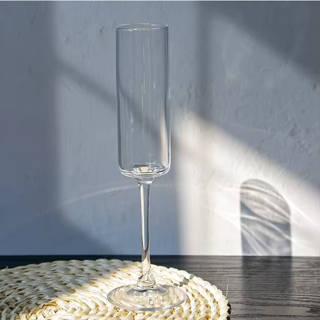 Flûte à champagne en verre de haute qualité avec un design lourd, disponible en plusieurs couleurs comme le noir, le rouge, le bleu, le vert et le jaune. Options de personnalisation des couleurs